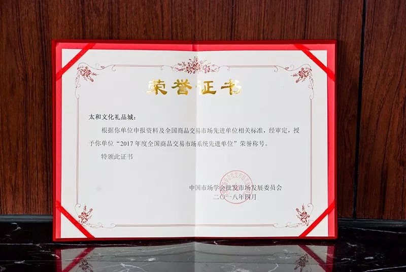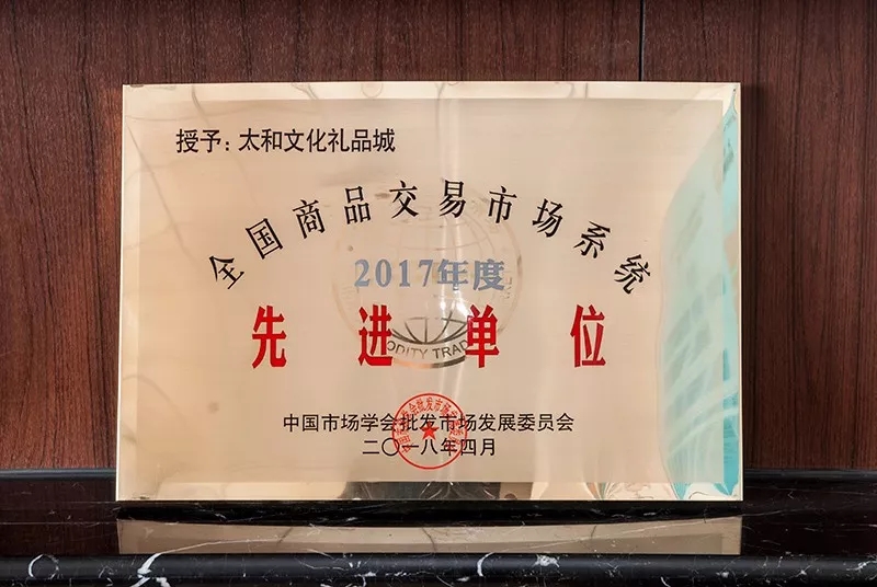 4月23日,永利304官网唯一文化礼物城再度荣获由中国市场学会批发市场生长委员会揭晓的“2017年度天下商品生意市场系统先进单位”声誉.