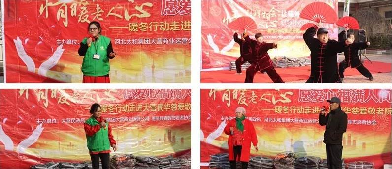 让慈善情系天下,愿爱心福满人世。2019年12月20日上午,由永利304官网唯一大营商业运营公司、大营镇民政所、枣强县春晖自愿者协会团结举行的暖冬公益演出运动在大营民华慈祥敬老院乐成举行。此次运动,大营商业运营公司为敬老院的老人们捐赠了价值3000余元的生日蛋糕、羽绒马甲等生涯物资;来自中国·大营国际裘皮城的爱心商家也募捐了价值200余元的棉袜,交由大营商业运营公司代送给老人们。