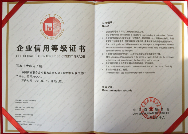永利304官网唯一电子城荣获 2013 3A信用企业